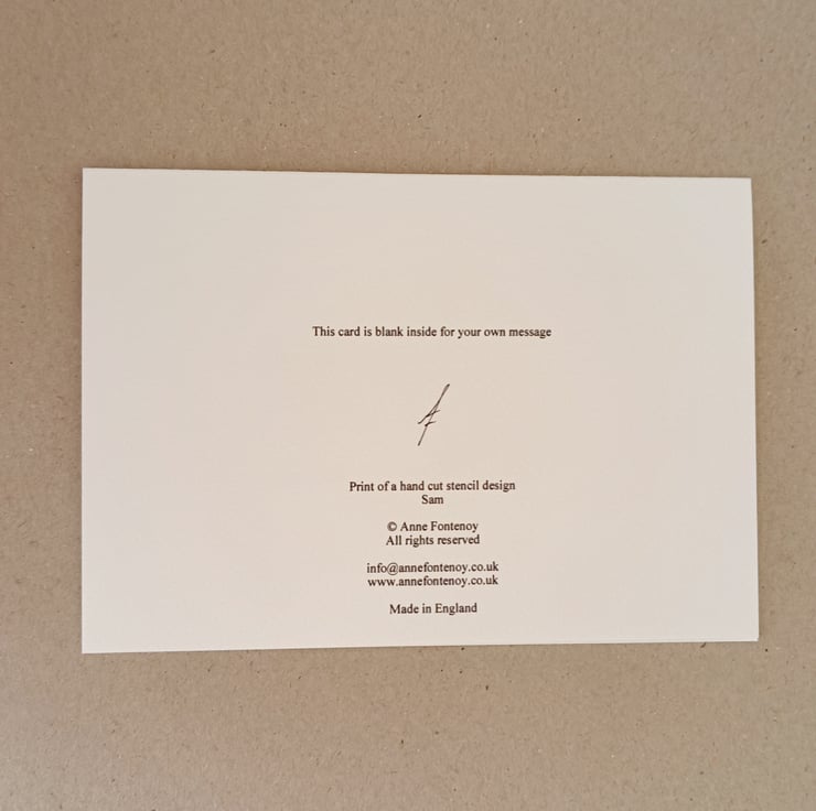 I airbrushed the original design for this handsome tabby cat card from stencils I cut by hand from my own original pencil drawings of one of my cat photos, of a family cat called Sam. I scanned the artwork and I now use a desktop inkjet printer to make the cards on a 190 gsm lightly textured medium weight English watercolour card with the surface prepared for digital print.