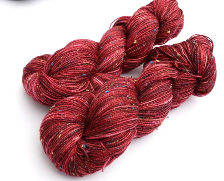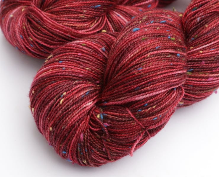 Burgundy, brick and crimson reds with lighter blush shades and pink, blue, olive and yellow neps. This is a soft superwash merino 4 ply weight yarn with neps spun through it that will add colourful flecks to the fabric. Recommended for scarves, shawls and similar items. Photos taken and edited in bright natural light. There is one skein left.