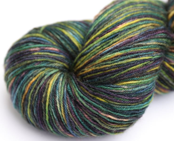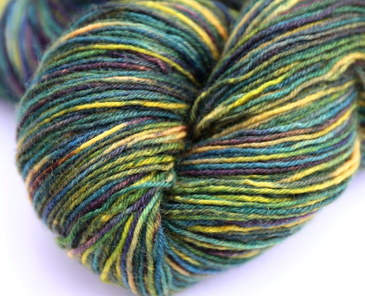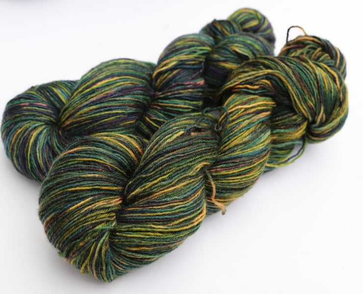 Mottled shade of green, purple, teal-blue and yellow. This Bluefaced Leicester superwash yarn is soft with a very slight lustre. Photos taken and edited in bright natural light. There are two skeins available (price shown is for one) - one skein (frst photo and front of third photo) is slightly lighter with more yellow and green shades, the other (second photo and rear of third photo) is slightly darker with more darker green and purple shades. If you have a preference, please let me know when ordering or I will pick one at random. If you wish to use both skeins in the same project, alternating skeins as you work is recommended.