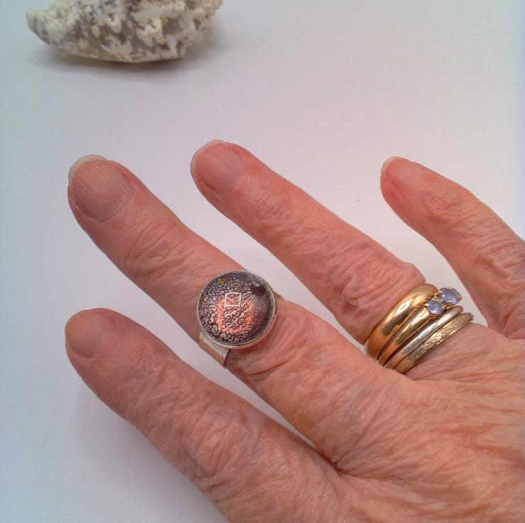 This very pretty adjustable ring would make an ideal gift for a friend or relative for a birthday or Christmas, or it would make a nice treat for yourself. It would go well with any of your Spring or Summer outfits for a day out, for a casual party, or for everyday wear. This "mystical" fantasy ring has an adjustable base so it will fit most sized fingers and it has a 15 mm round purple dragons eye cabochon set on it. The ring base is silver plated. The ring will be dispatched wrapped in tissue paper in an organza bag and delivered to you via Royal Mail first class post. The actual shade of the cabochon may vary depending upon your monitor set up.