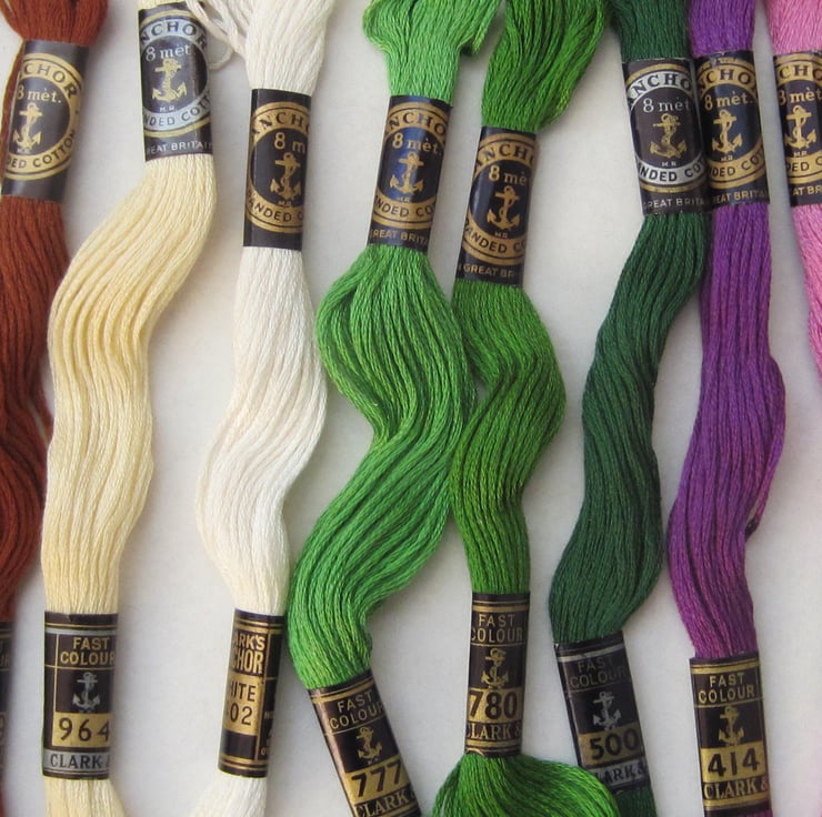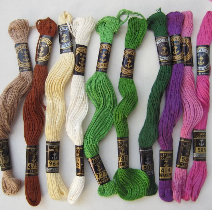 Assortment of Anchor embroidery threads in different colours of white, cream, brown, green and purple.