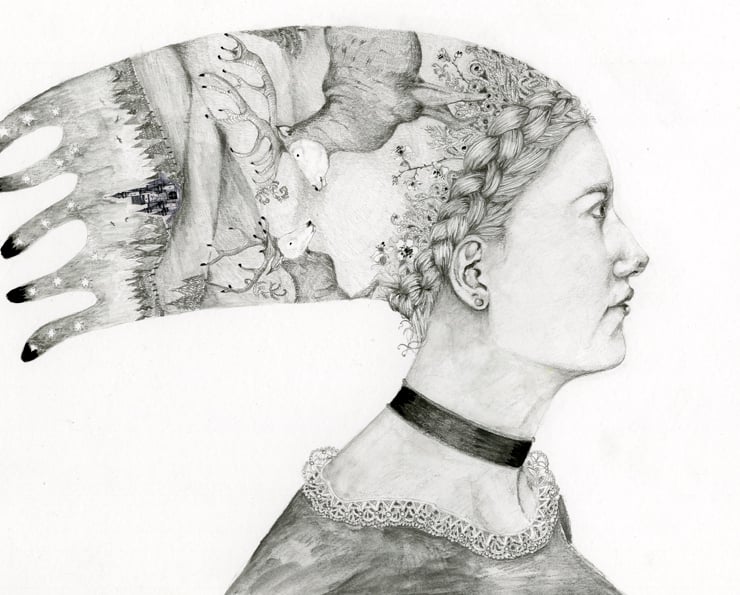 Another in my series of women in headdresses. This is a pencil drawing (with a tiny element of collage, the castle)