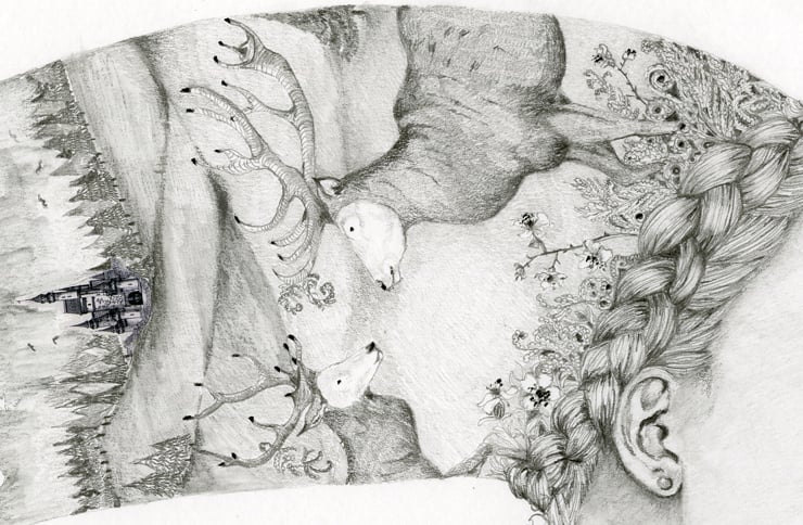 An original pencil drawing of a woman in profile wearing a head dress depicting two deer in a landscape.