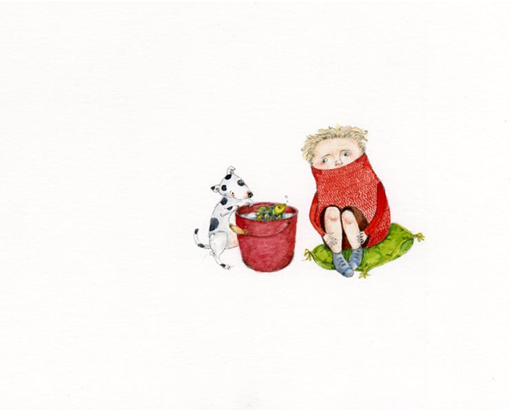 This is a small original illustration of a small boy, his little dog and a fish in a bucket.