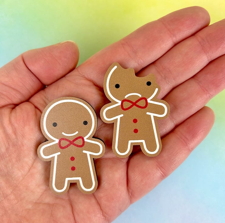 Choose between a happy gingerbread man and a sad bitten cookie or buy both together at a special discount.