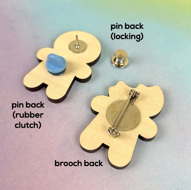 Choose from either a standard brooch back or a pin back (similar to enamel pins). Pin backs can include either a rubber clutch or a metal secure locking back (for wearing outdoors). Check the photos to see all options.