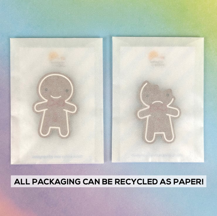 Packaged individually on a backing card inside a translucent glassine bag, which can all be recycled as paper.