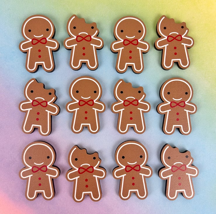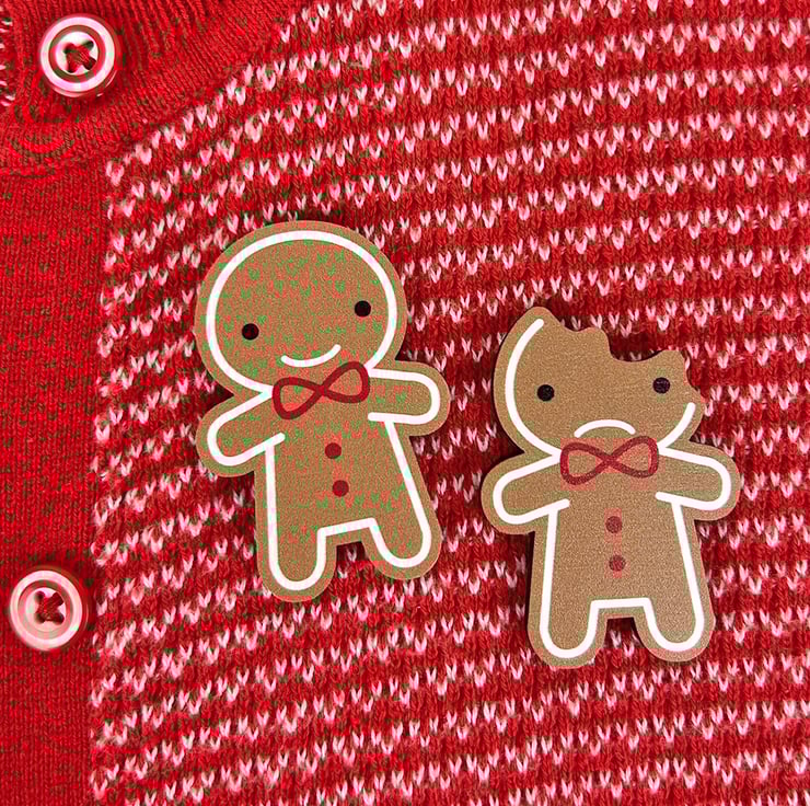 These kawaii wooden gingerbread man pins are ready for Christmas with bowties, gumdrop buttons and an iced outline. They'll add a cute touch to your party outfit or last day of work and make adorable Secret Santa gifts or stocking fillers.