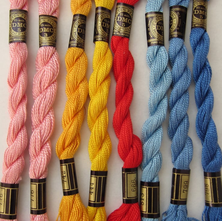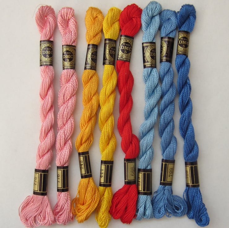 Selection of 8 skeins of DMC cotton perle thread in assorted colours of blue, pink, yellow and red.