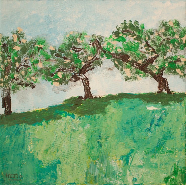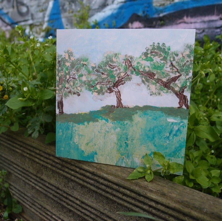 This card measures 125mm square and comes wrapped in a clear cello bag with a white envelope. It has been left blank for your own message. It is a reproduction of a painting I made during the spring of our local park and the original is acrylic on canvas.