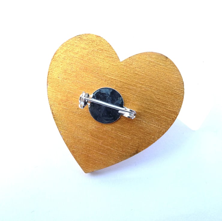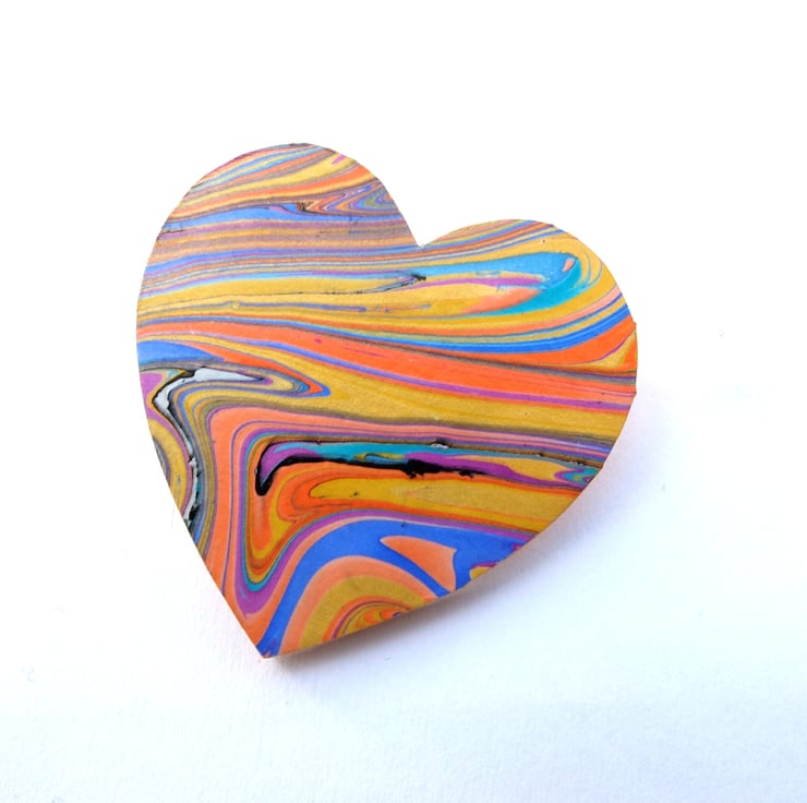 This is a cute statement item to wear! I have used some of my unique marbled paper on a wooden heart shape and fixed a brooch fitting to the reverse for a colourful and unusual piece of jewellery.