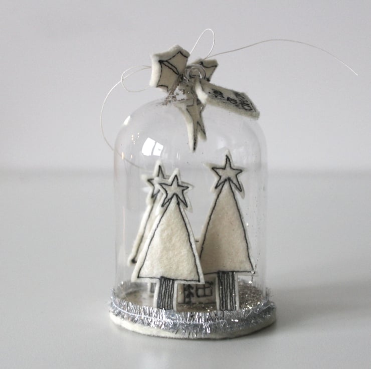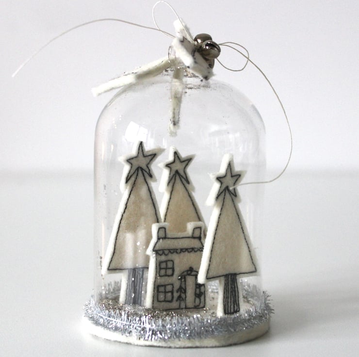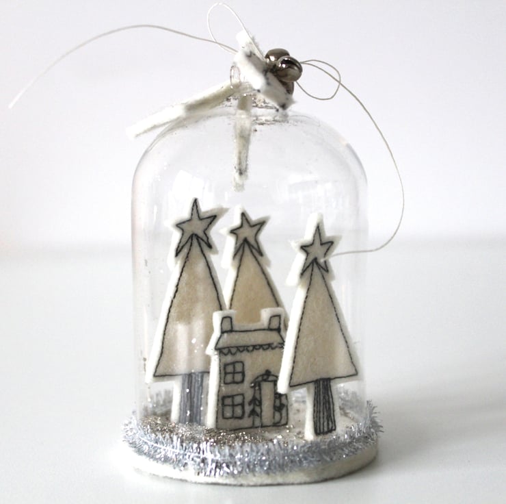 'Home for Christmas' is created using free hand machine embroidery and 100% wool felt. The festive scene is encapsulated within a glass dome, with vintage glass glitter snow (not real, sorry), a heart, three bells, two holly leaves and a sign 'Home for Christmas'. Delicate tinsel finishes of this delightful Christmas decoration.