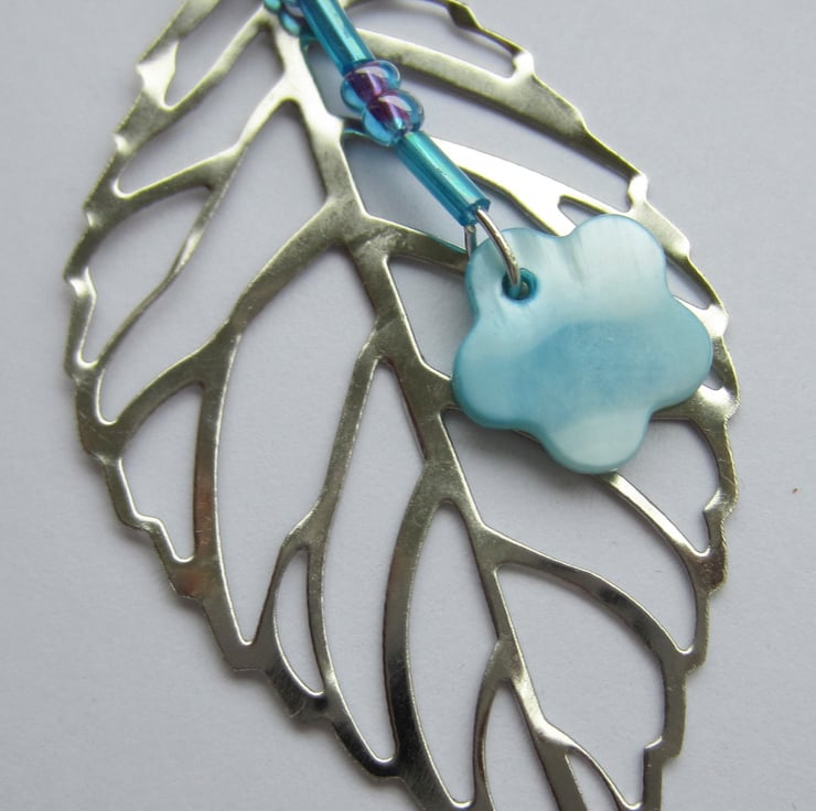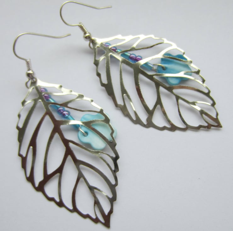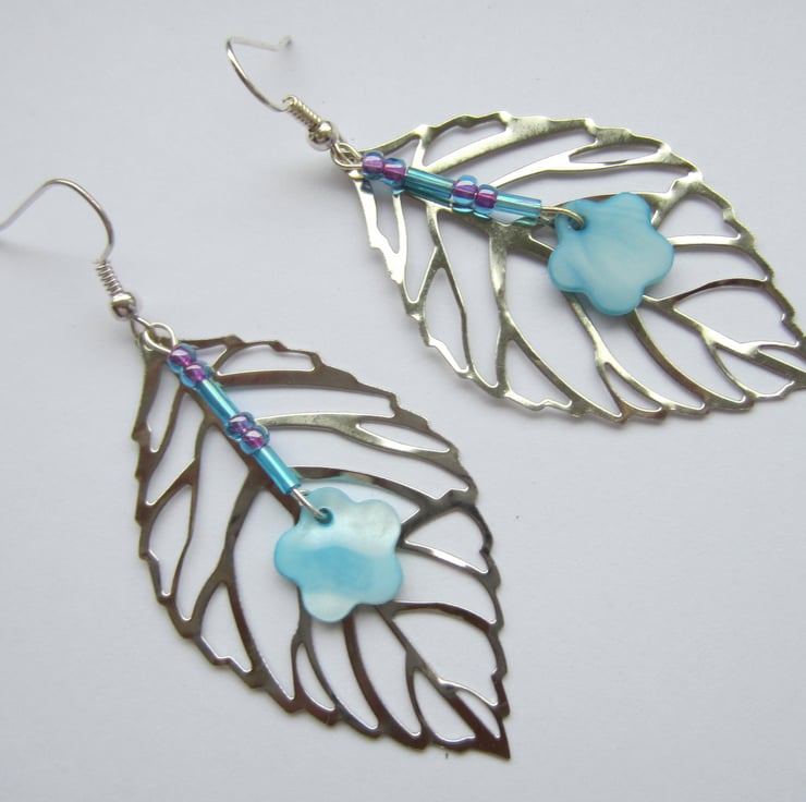 Pretty drop earrings made from a large metal leaf with a blue mother of pearl effect flower bead and other blue and lilac beads.