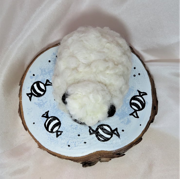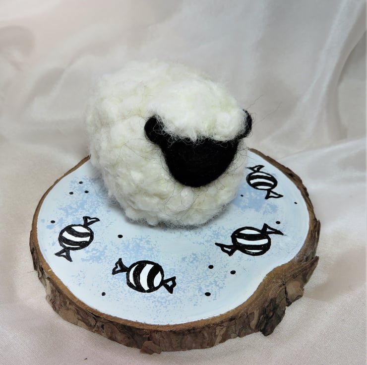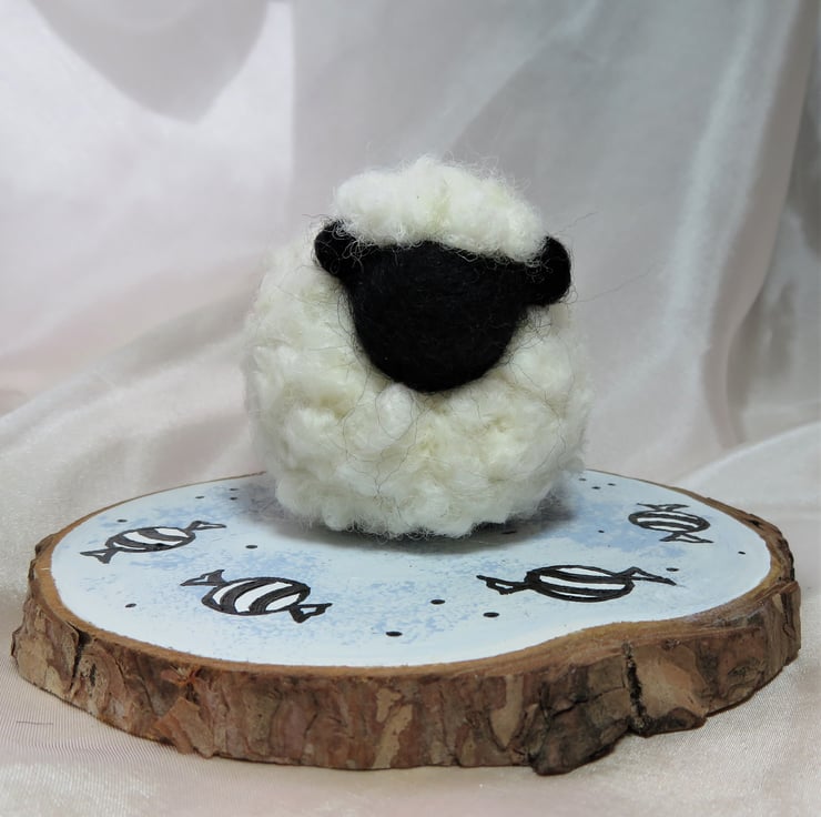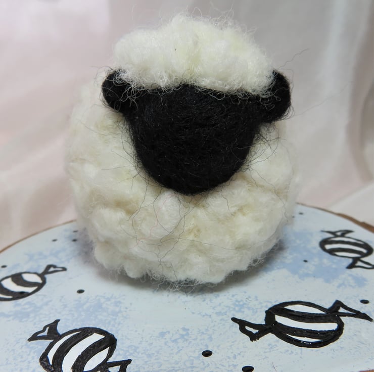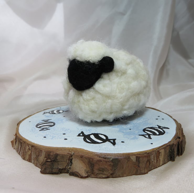 Elspeth is a needle felted sheep sculpture measuring approx. 7cm x 6cm x 5cm, sitting in her own field of great grumpiness (approx 10cm diameter). Bah Humbug!