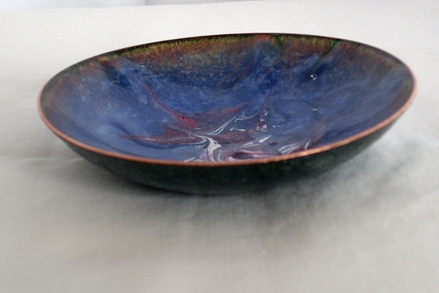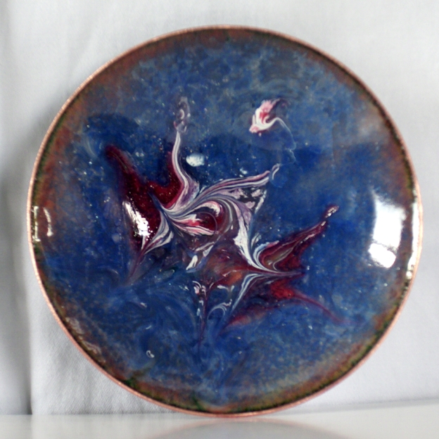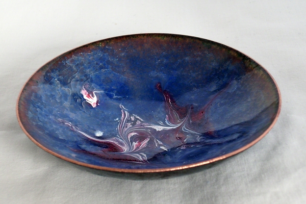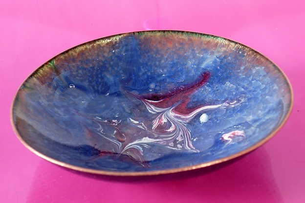 After building up a base of several layers of clear enamel on the copper dish I have added a coat of blue enamel. After firing that coat I scattered white enamel powder around the centre and added red, amethyst and pink enamel to it. The amethyst and pink are transparent and need to be fired over white to be seen. When the dish was at red hot in the kiln I disturbed the surface of the enamel with a steel point to make the unique patterning that you see. The dish is counter-enamelled; a coat of enamel on the reverse, the second coat I apply when building up the layers, balances the tensions of expansion and contraction as the dish id developed. This coat will show marks of the stilt or trivet used to hold the piece at a minimum number of points while it is fired.