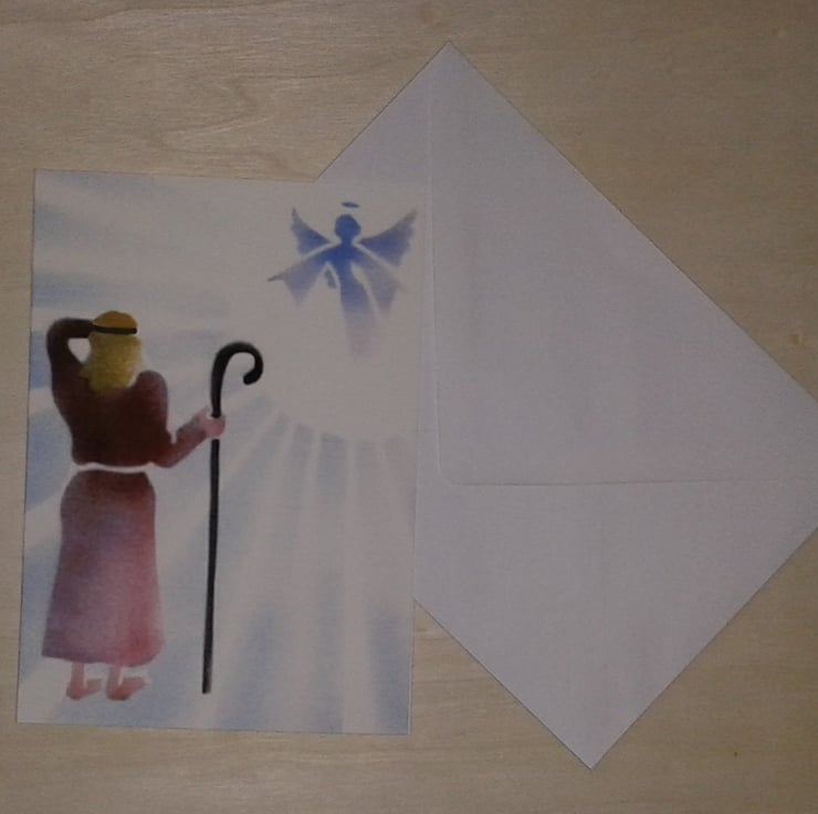 Shepherd handmade Christmas card. I drew this completely from imagination and then I made hand cut stencils from the pencil sketch. I airbrushed the original design from the stencils. I have scanned the original artwork.