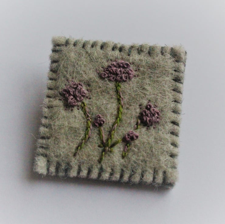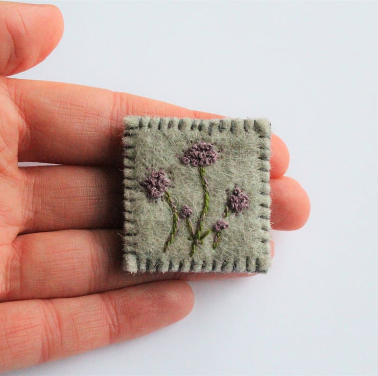 This textile brooch is made from 100% wool felt and has been hand embroidered with a wildlower called Devil's-bit Scabious. The wildflower can grow to 80cm tall and flowers from July to September. My embroidered Devil's-bit Scabious is always in flower! The head of the flower had been embroidered using french knots in purple thread with tiny stab stitches all around the head. The stem has been embroidered in split stitch in green and a single thread of purple to give the stem a soft hazy look as the stem of the plant is covered in soft hairs.