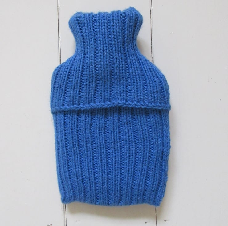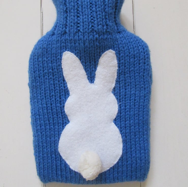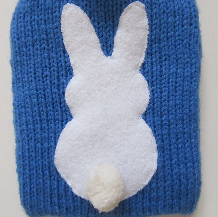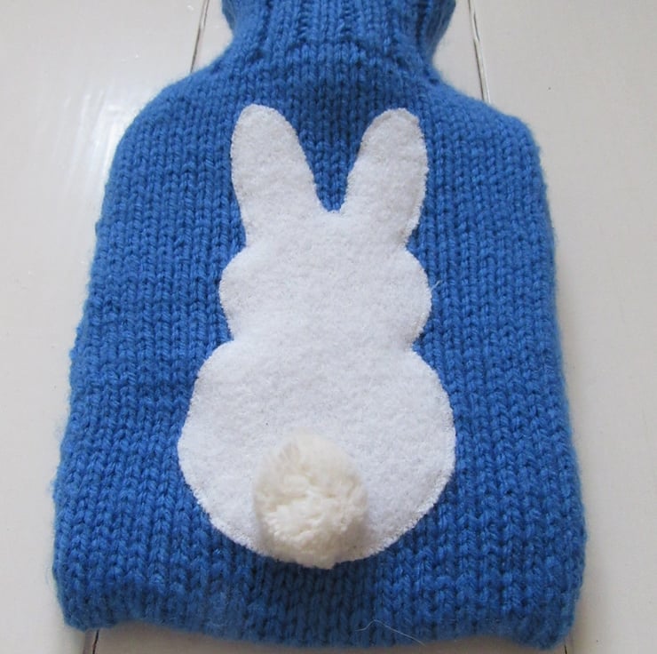 Hand knitted, bright classic blue hot water bottle cover, with a cream woolly bunny appliqued on the front, who has a very cute pompom tail on his bottom. The back is knitted in a chunky rib stitch which ensures a good snug fit and for extra insulation. The envelope style opening allows access for filling and to remove the bottle if required. Just the perfect size for a little person!