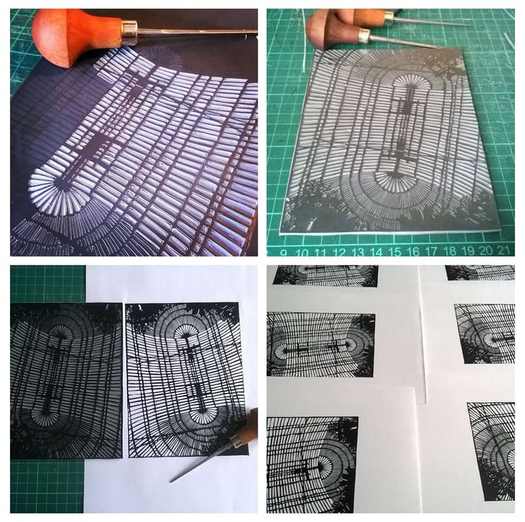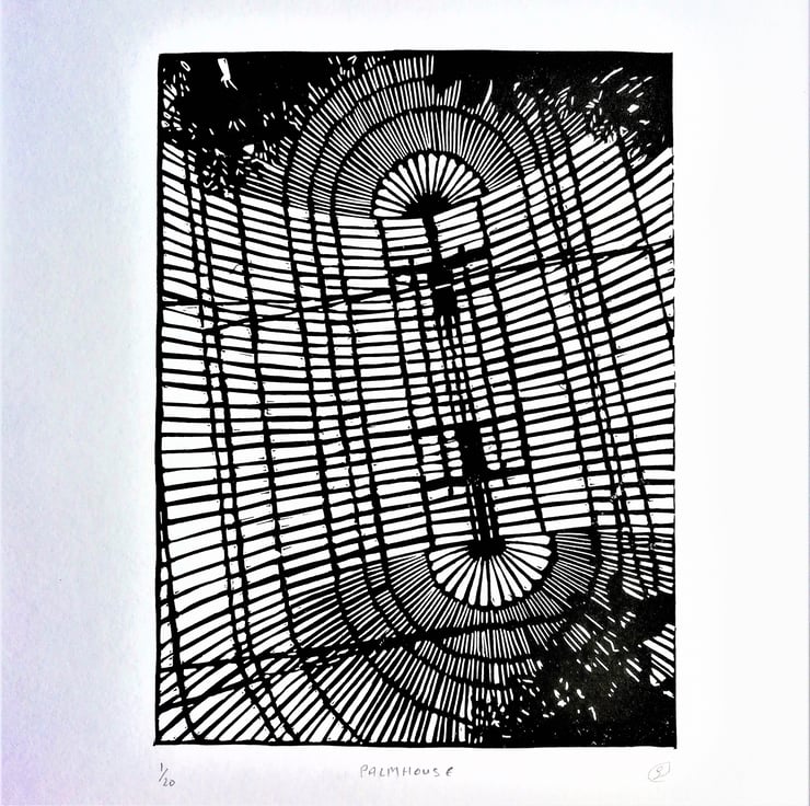 Hand printed 1 colour oil based lino print of a Palmhouse rooftop,