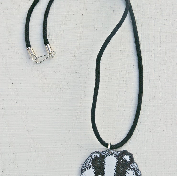 I hand cut my Badger's Head Pendant shape in copper, so you can be sure it is a design unique to my work. The pendant measures approximately 4cm wide by 3cm high and is enamelled on the front face in black and white. The enamel built up in layers on both sides with firings in between. The Badger's features are applied in the final layer. The enamel on the reverse gives strength and durability to the pendant. It is suspended from a black cord with silver-plated clasp which I offer in a variety of lengths. The pendant is supplied in a quality card gift box, packaged in an exterior box and sent by Royal Mail 'Tracked' postage.