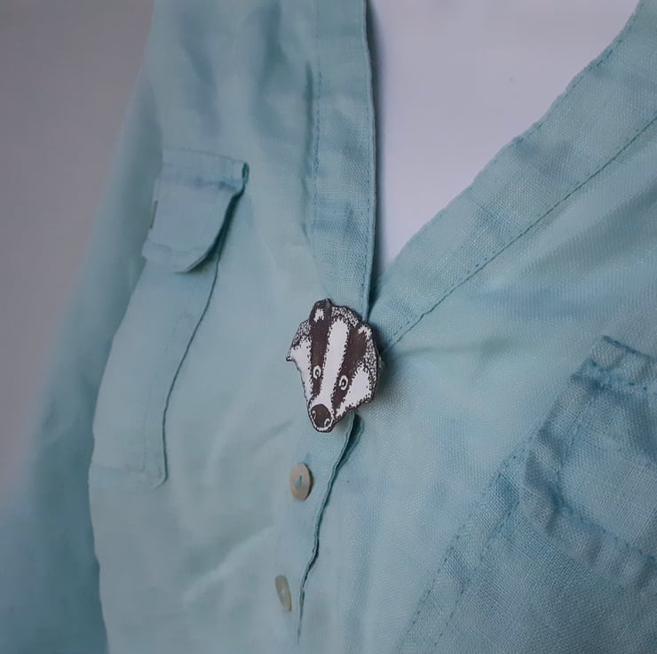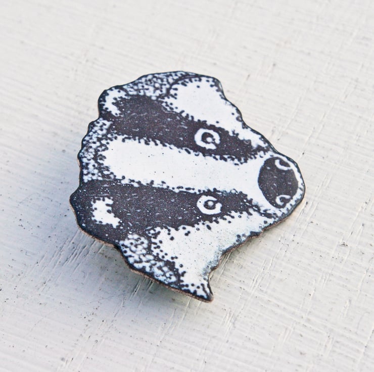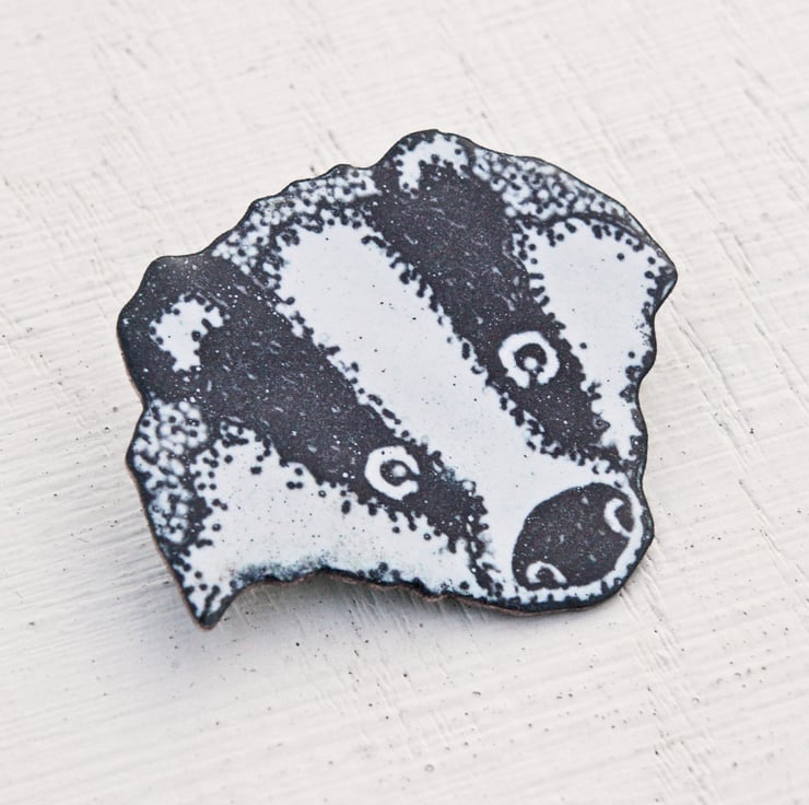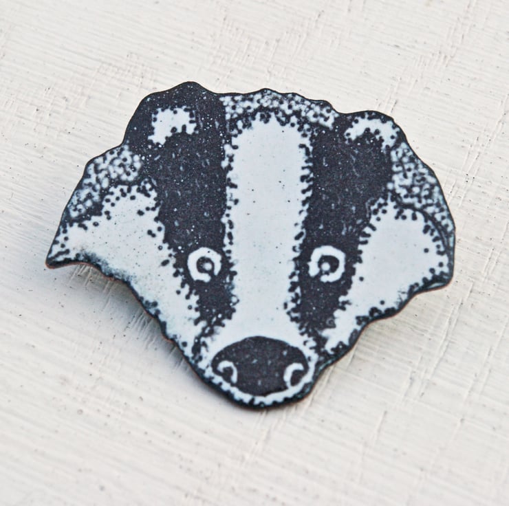 I hand cut my Badger's Head Brooch shape in copper, so you can be sure it is a design unique to my work. It is then enamelled in black and white. It measures approximately 40mm wide x a little over 30mm high. The enamel powder Is applied in layers with firings in between and to both sides of the copper. The reverse is enamelled to give strength and durability to the brooch. The final layer is when the badger's head motif is applied. The brooch has a silver-plated pin attached and is supplied in a quality card gift box. It will be sent (packaged in an exterior box) by 'Tracked’ Royal Mail postage.