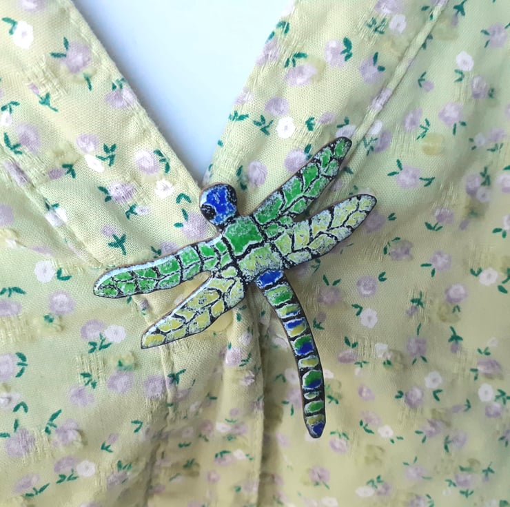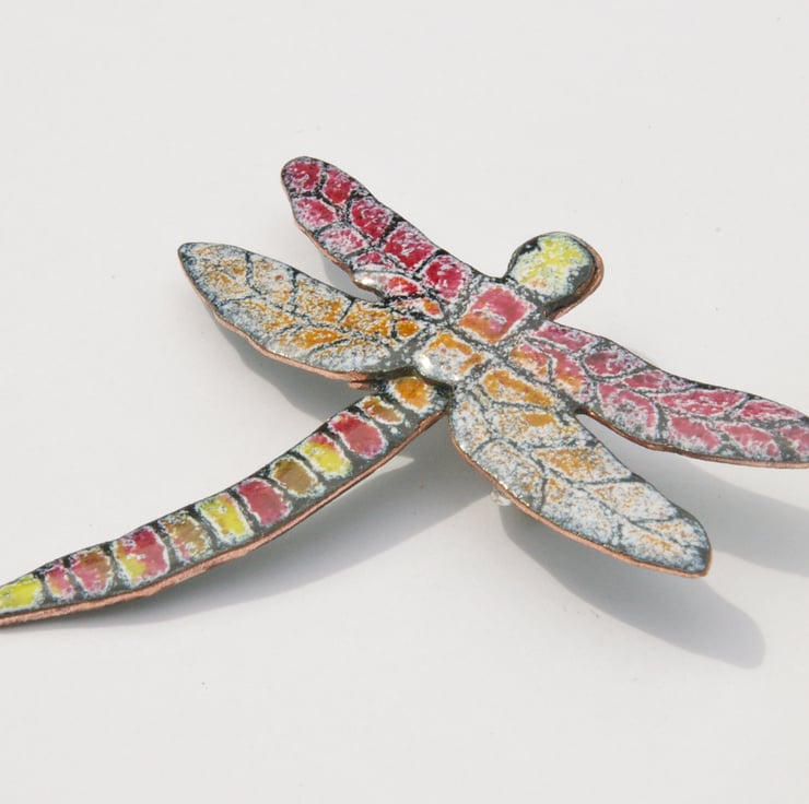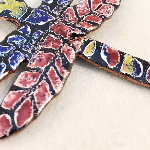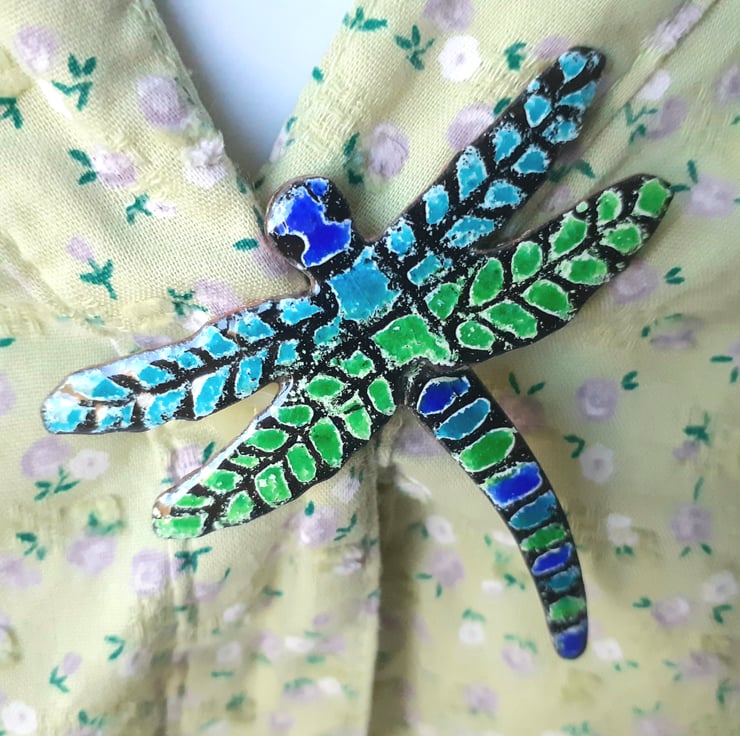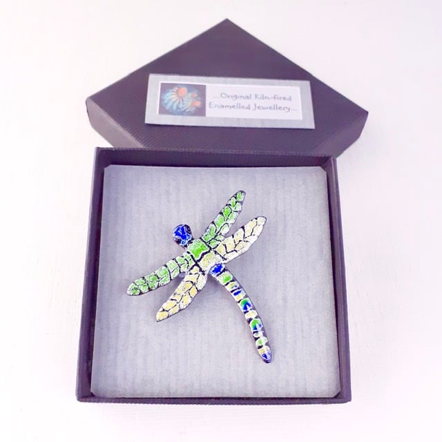 A large hand cut dragonfly brooch a little over 50mm in width and height in a design is unique to my work. It is constructed of two parts, and the copper pieces are assembled to form the dragonfly. it is then enamelled on both sides, in layers with firings between. The final layer of enamel is the one where the detail of the wings and body created. The enamel on the reverse gives strength and durability to the Dragonfly Brooch I offer it in two colour ways. A silver-plated brooch pin is attached. The dragonfly will be supplied in a quality card gift box and is sent in a card packaging box by 'Tracked' Royal Mail postage.