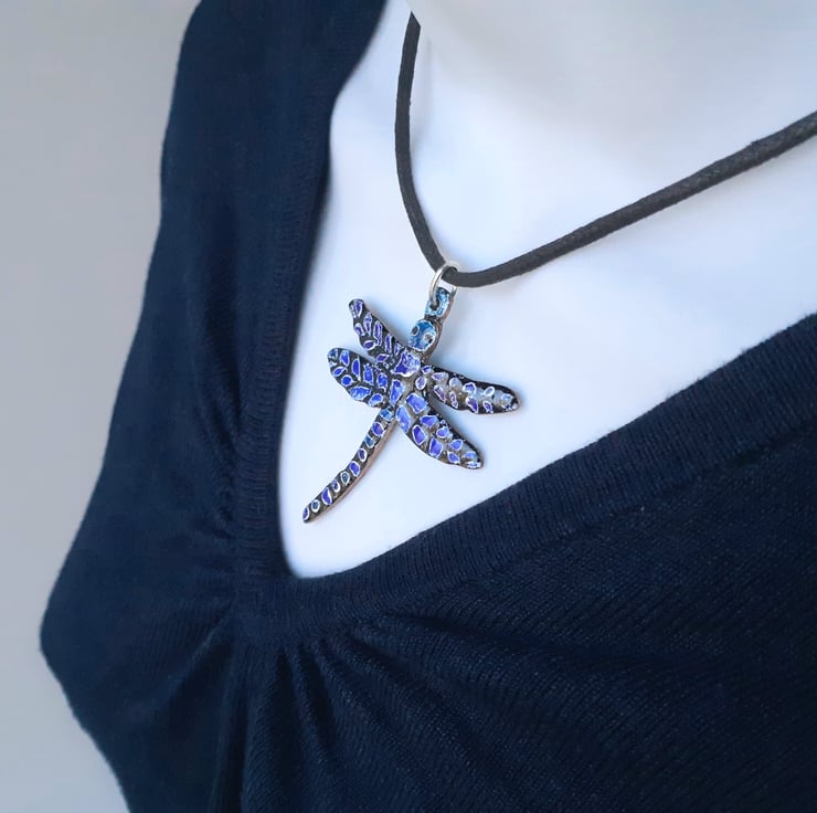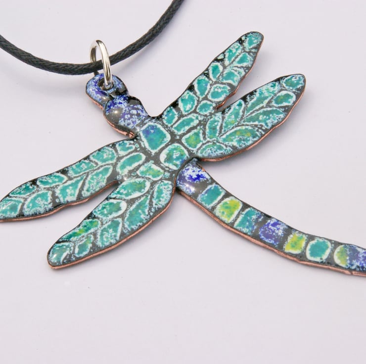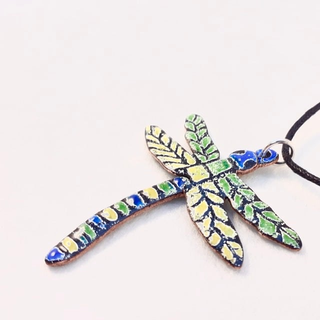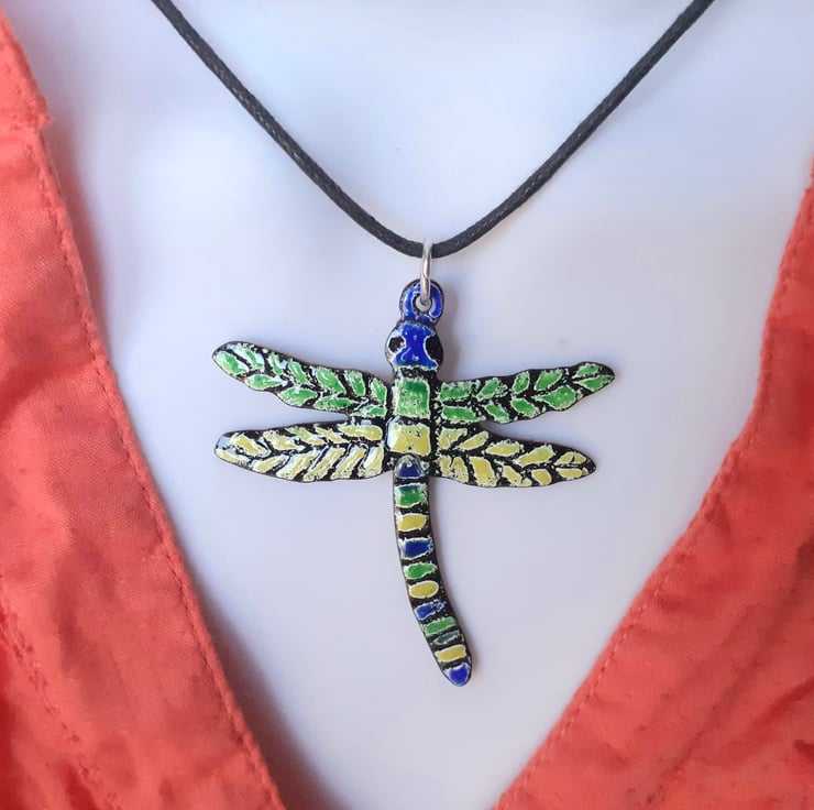 I hand cut this dragonfly pendant which measures a little over 50mm both wide and high so you can be sure of a design unique to my work. It is constructed in two parts, a body section and one for the wings, and riveted together. Next it is enamelled on both sides, a number of times, building up layer. The final layer creates the colourful details of the insect. The enamel on the reverse gives it strength and durability. I offer it in two colour ways and it hangs from a black cord in a choice of lengths with a silver-plated hook clasp. The pendant is presented in a gift box and sent by Royal Mail 'Tracked’ delivery and has an outer card packaging box for protection.