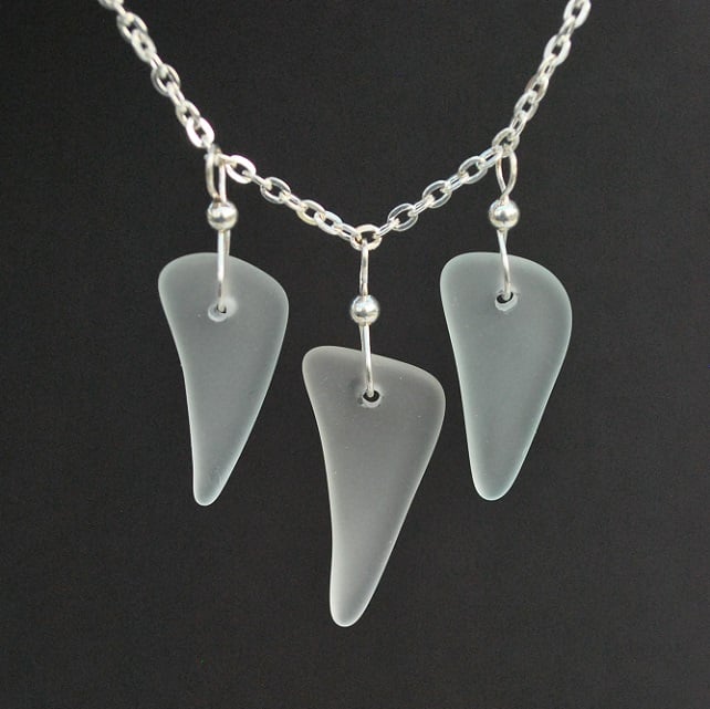 Dainty and charming, this necklace is made of three pieces of tumbled beach glass which go together perfectly. The centre icicle is white and the other two very pale aquamarine. The icicles have been mounted using silver plate beads.