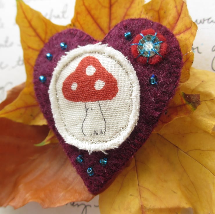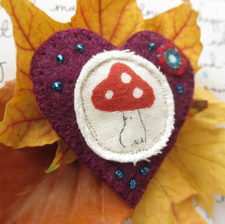 Mushroom Brooch. Toadstool Brooch. Heart Brooch. Handmade Felt Brooch.