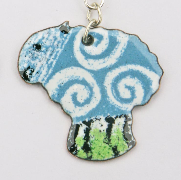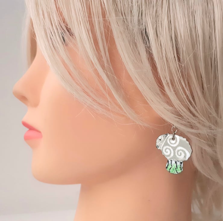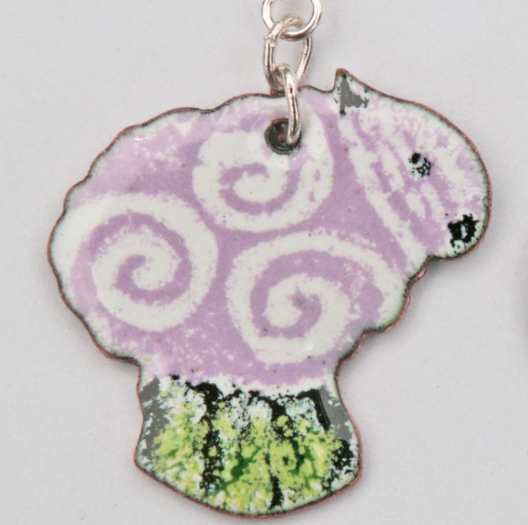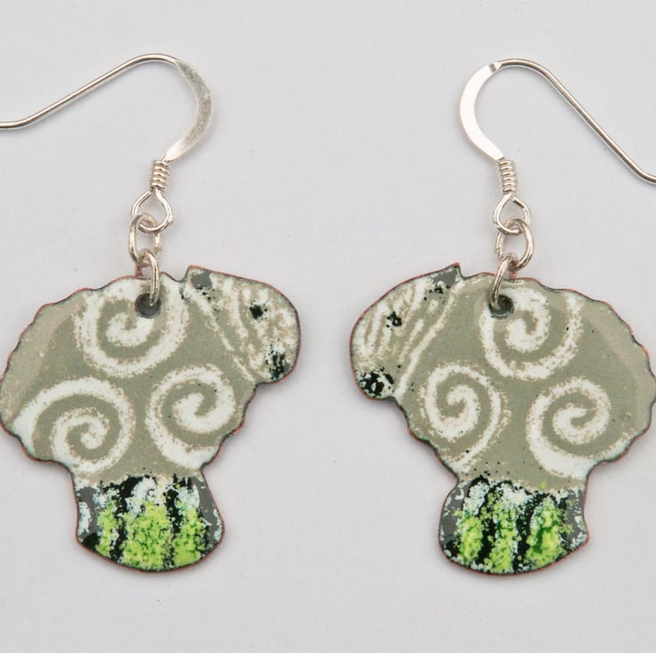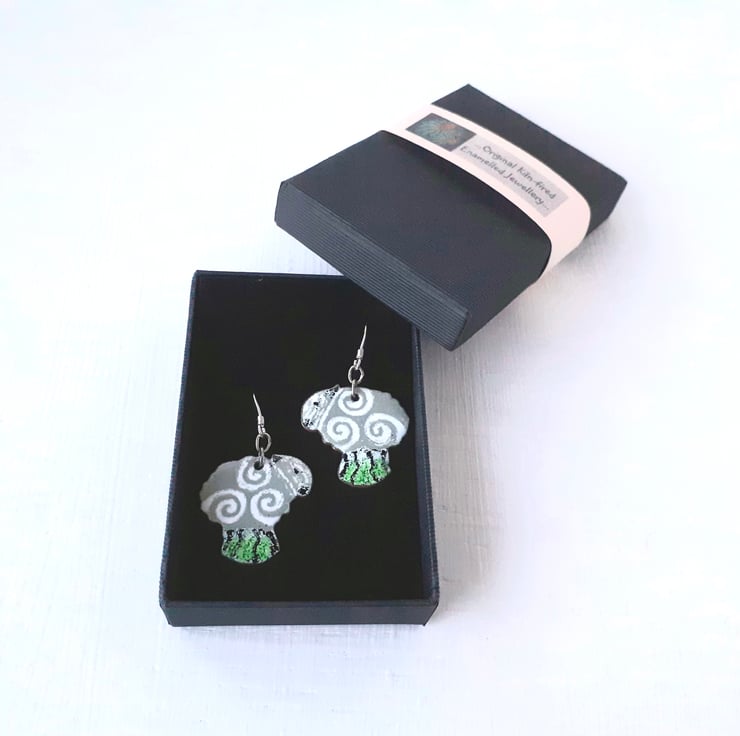 Hand cut sheep-shaped enamelled copper earrings to my own unique design. Sheep with colourful curls on white standing in the grass, with silver earwires. They are around 20mm wide and a little taller. Several colour ways are available. These earrings have been enamelled on both sides several times with firings between each layer. The earrings are supplied in a quality card gift box and sent by 'Royal Mail Tracked’ delivery in an outer packaging box for protection.