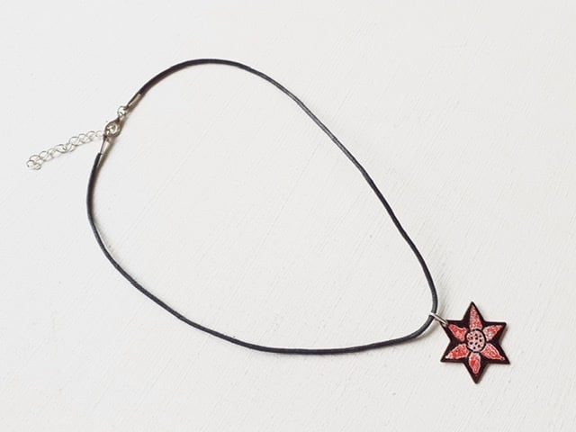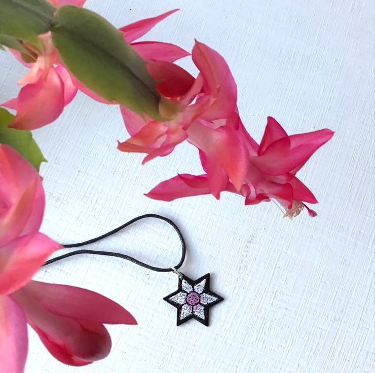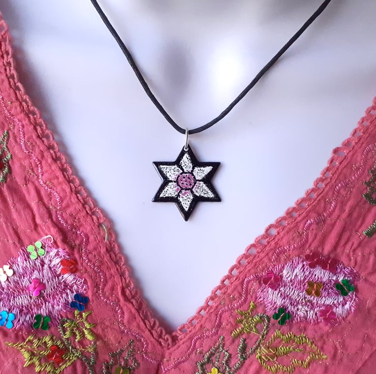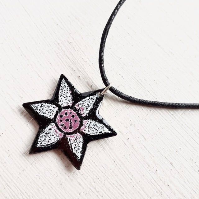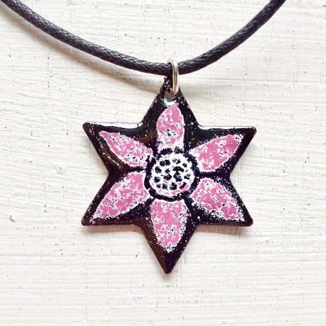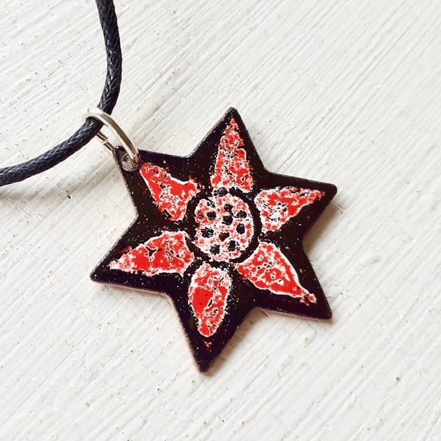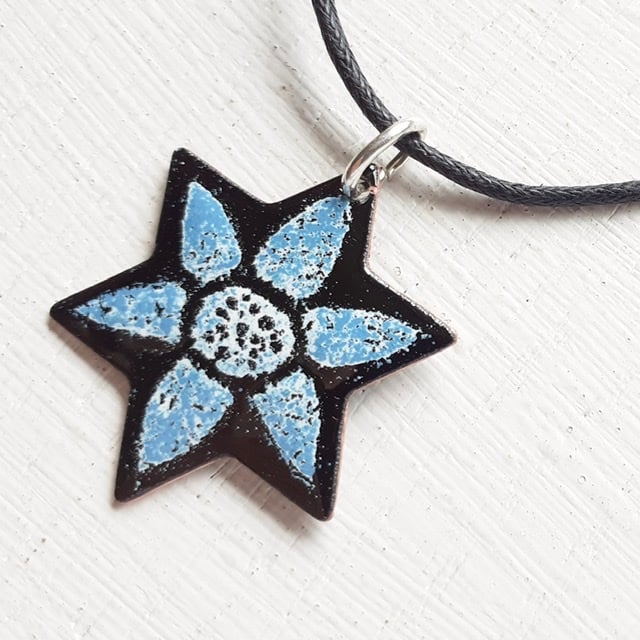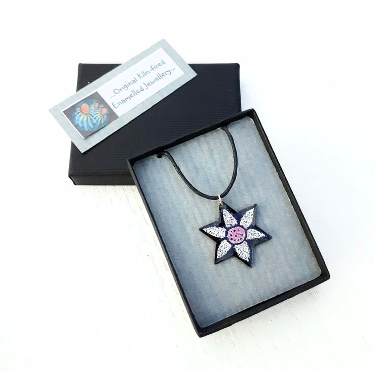 My Star Pendant ‘Starflower’ is a star-shaped pendant with a simple flower design against a black background and suspended from a black cord, available in several colours and a variety of lengths with a silver-plated fastener. The starflower pendant is enamelled on both sides, several layers of enamel powder have been applied to both sides with firings in between to fuse the glass to the copper base. This pendant is supplied in a quality card gift box and sent by Royal Mail 'Tracked’ delivery in an outer packaging box for protection.