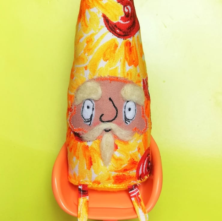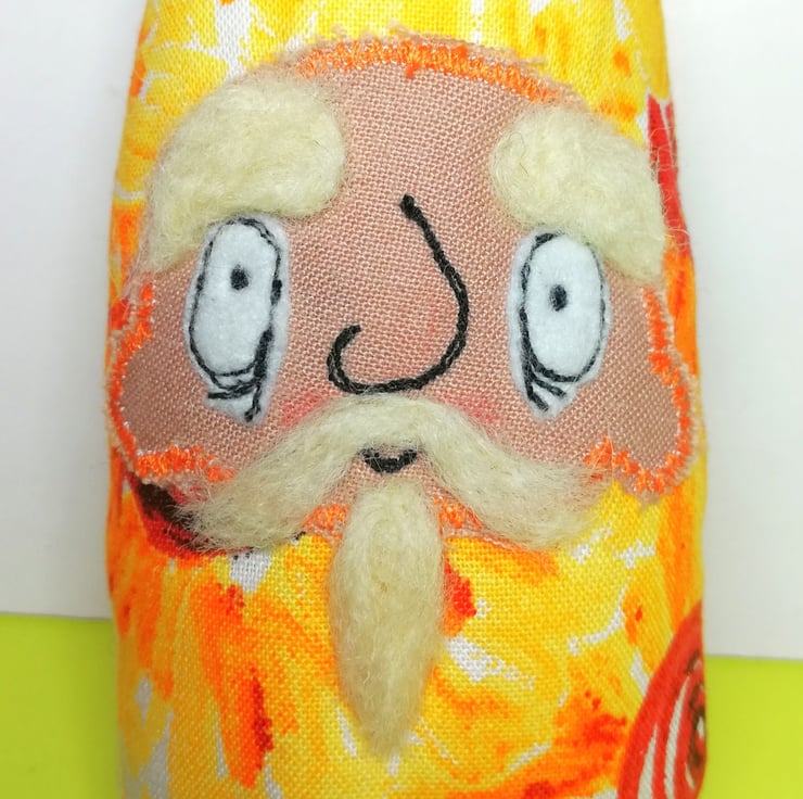 His base is felt and hand sewn on measuring roughly 6cm across. He sits unaided and is roughly 16-17cm tall. This is a unique, one of a kind creation, made for decorative purposes only. Not a toy.