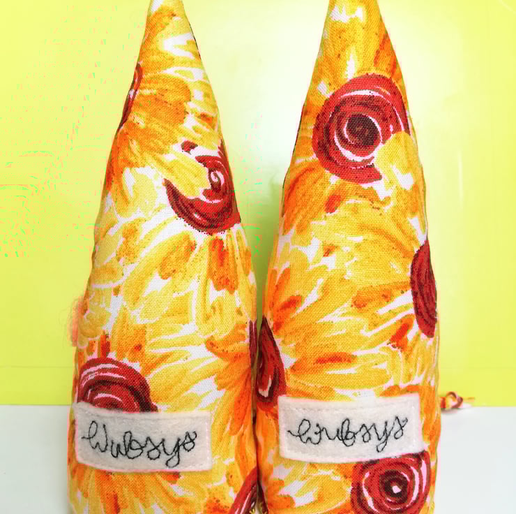 Floral gnome Gerd has dangly hemmed legs with knotted knees and ankles. His hair is needle felted wool and his face is machine embroidered with felt eyes and rosy wax cheeks.