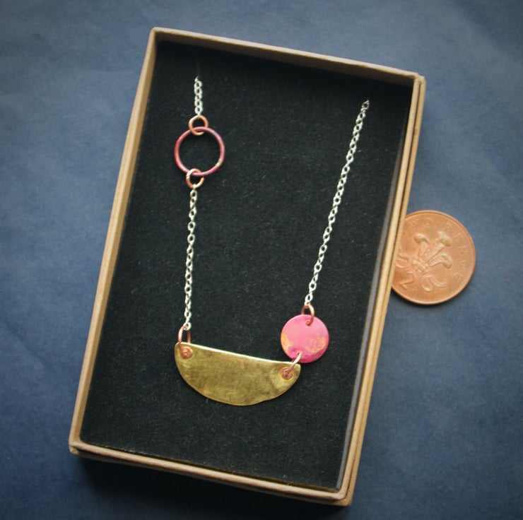 I have cut out a half moon shaped piece of brass 35mm /1.5 inches in diameter and carefully made copper rivets in the corners to attach it a sterling silver chain . The chain has a fine link and I have put a copper ring into it , the size of a penny on one side, 30mm/ 1.25 inches from the brass piece and a copper disc on the other side .