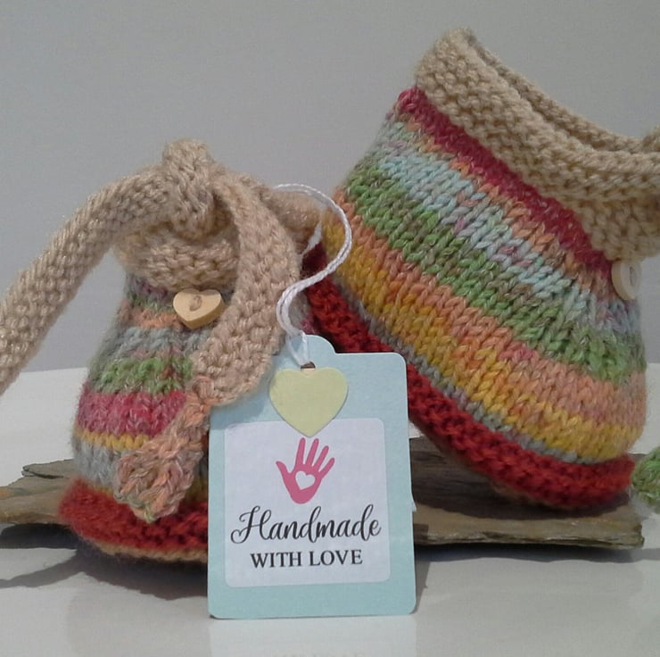 A lovely pair of unique designer baby booties totally hand crafted using quality branded British machine washable manufactured yarns with cotton and wool blends. They have a delicate little genuine wooden heart shaped button at the top for an added feature.
