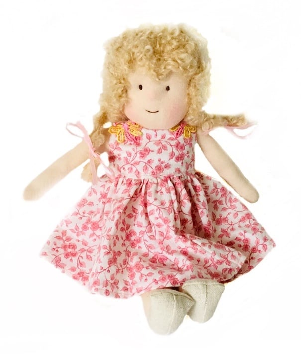 She is a cute little rag doll made from best quality de Witte doll skin from Holland. She is very soft and squeezable and sits down easily. Her blond hair is made from wild mohair and her cheeks are coloured with pure beeswax. She is dressed in a really pretty pink and white dress with little embroidered butterflies on the shoulders and at the fastening on the back. She has pink ribbons in her hair