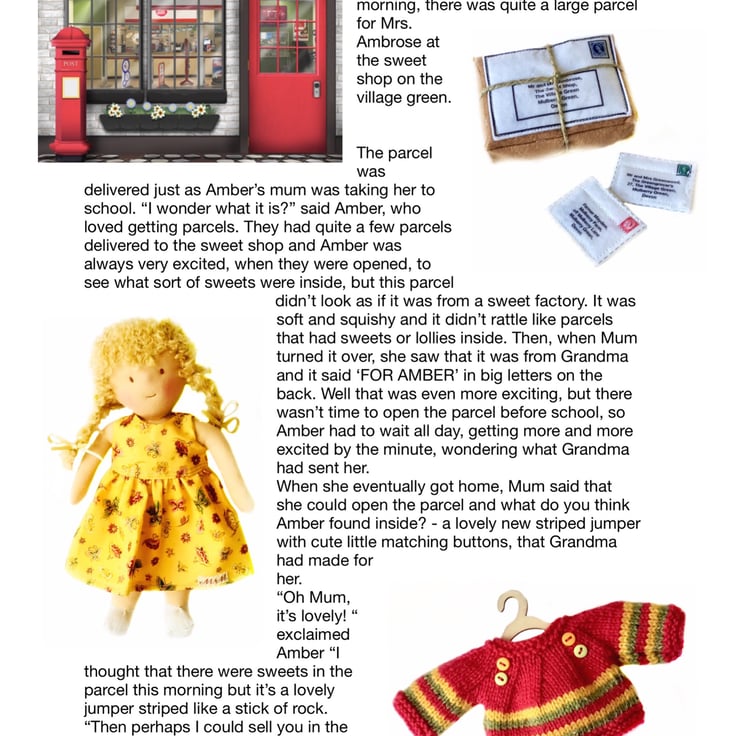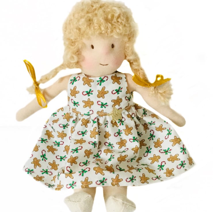 Amber lives at the sweet shop in Mulberry Green. She is a cute little rag doll made from best quality de Witte doll skin from Holland. She is very soft and squeezable and sits down easily. Her blonde hair is made from wild mohair and her cheeks are coloured with pure beeswax. She is dressed in a cute gingerbread man print dress. The dress is made from best quality cotton and has a lined bodice. It is decorated with a gold star. Amber has golden ribbons in her blond plaits to match her dress.