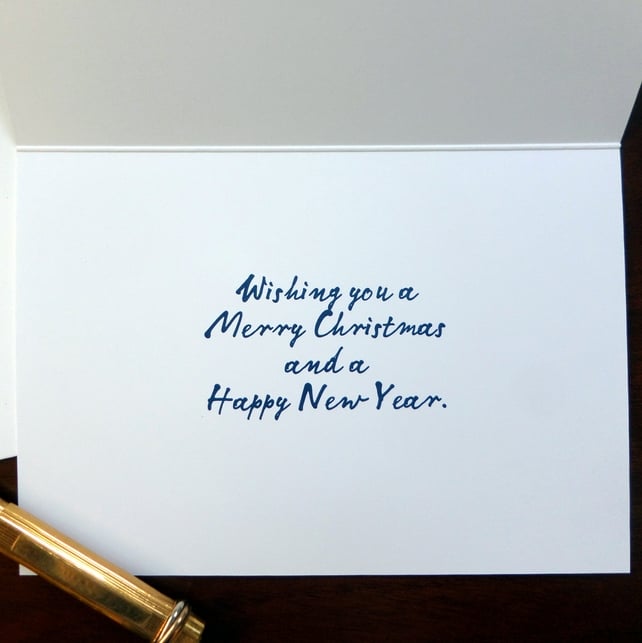 The words 'Merry Christmas' appear on the card front. Inside is the greeting: 'Wishing you a Merry Christmas and a Happy New Year' printed in blue.