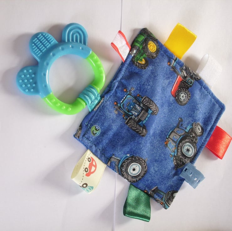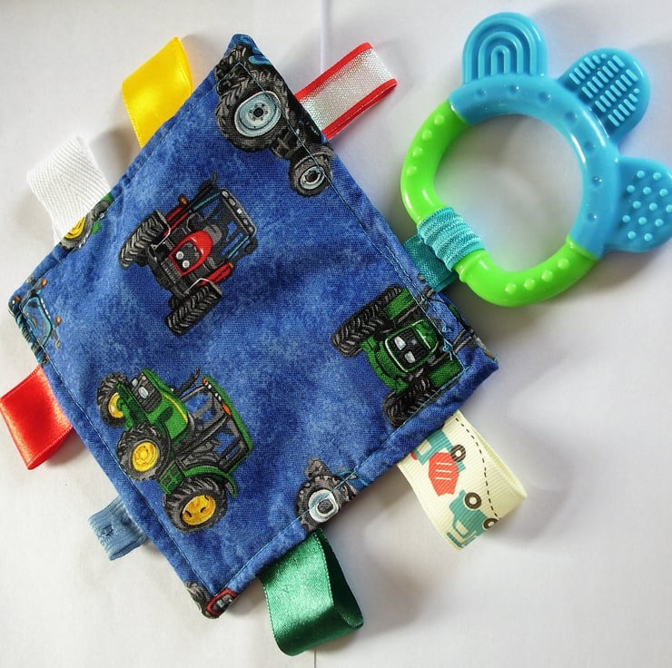 This is a fun bright blue cloth (5" x 5") with red, green and blue tractors printed on both sides. I have stitched ribbons of various colours, widths and textures around the edges to form tags, and have attached a green and blue teether. The tags are all double stitched for security and the teether is from a reputable British dental supplier. The tagged teether is CE marked and machine washable.