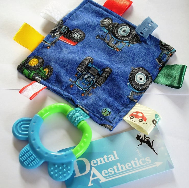 When my youngest grandchild was teething and dribbling constantly, it occurred to me that what he needed was a good teether and a cloth to wipe his sore chin. I found an offcut of cotton fabric and some ribbons from my stash and made him a tagged cloth, to use for his chin. I researched on the Internet to find a source of safe teethers, bought one and attached it to the cloth. For two years he carried his tagged-teether wherever he went. Since then I have made many tagged-teethers. I don't know what 'Dental Aesthetics' thinks I do with all those teethers!