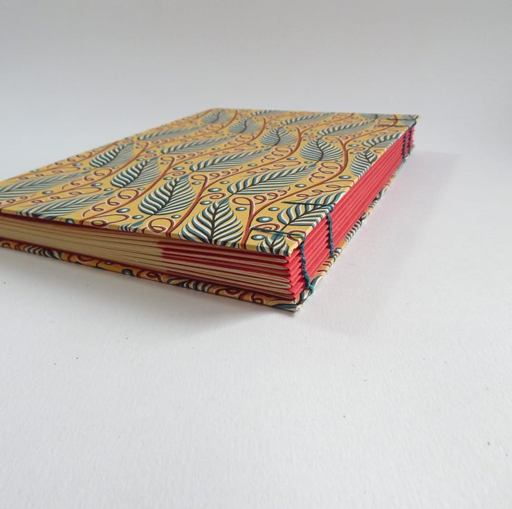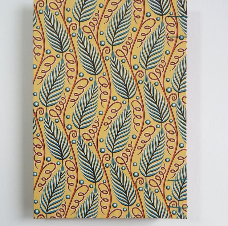 Hard covered journal or sketchbook with leaf pattern covers and a hand stitched binding.