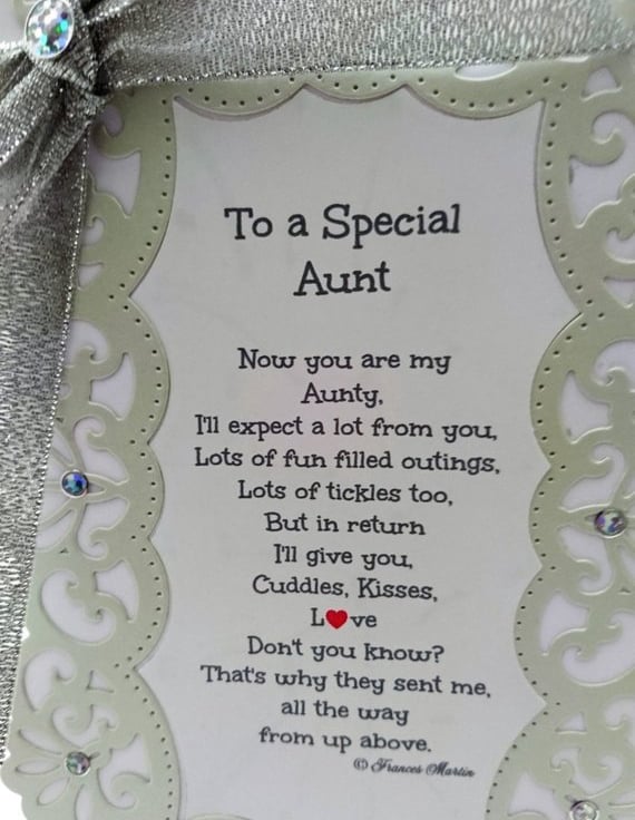I wrote this verse as a message to A Special Aunt, Aunty. from the newborn baby girl or baby boy. Copyright remains with © Frances Martin HeartToSoulCards Please do not claim this verse as your own or reproduce. Thank you.