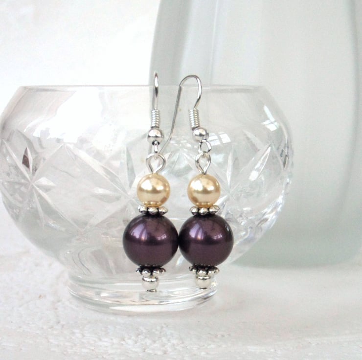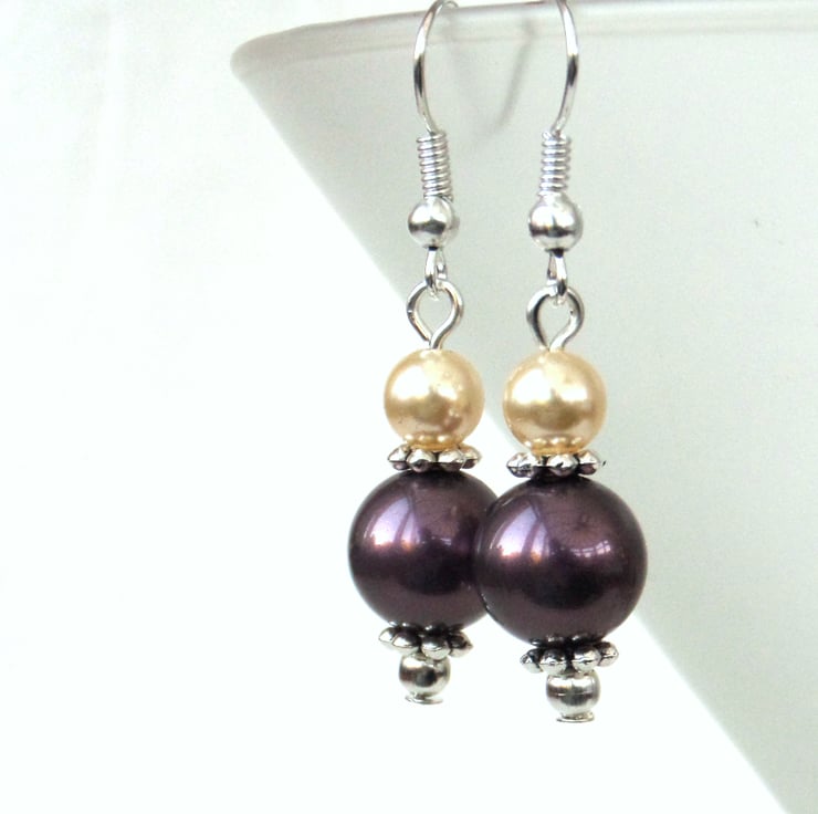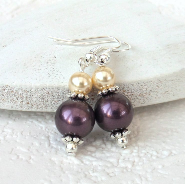 Lovely mocha shell pearls hang with a cream crystal pearl by Swarovski. They can be ordered with sterling silver or silver plated earwires.