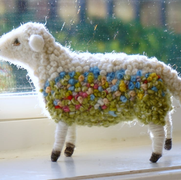 This sheep is needle felted over a wire armature then embroidered with various natural yarn and embroidery threads.Measures approx 14 cm long and 12cm high