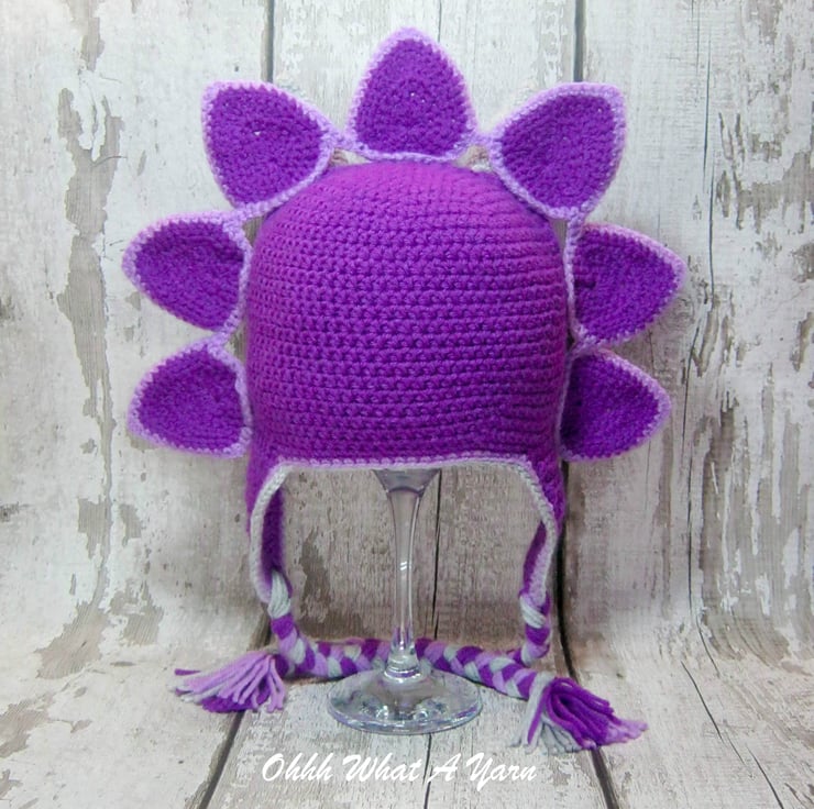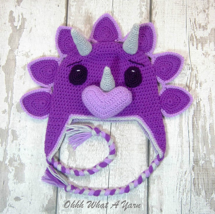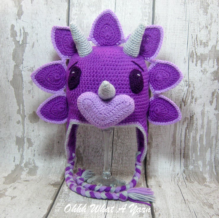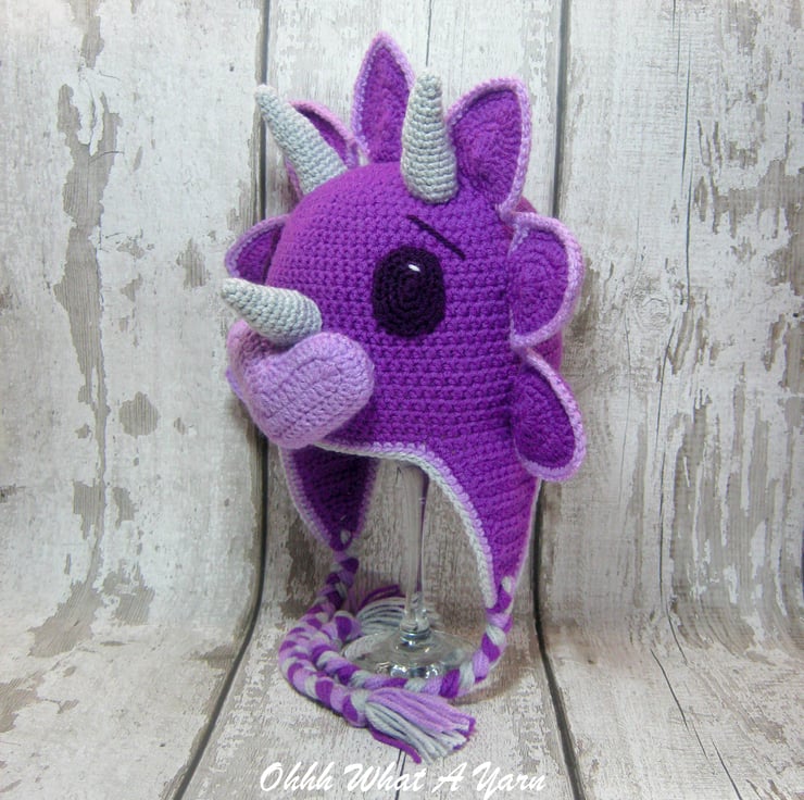 This gorgeous bright purple coloured 3D crochet triceratops dinosaur hat is crocheted using 100% acrylic yarns.