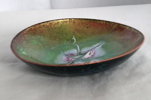 After building up a base of several layers of clear enamel on the copper dish I have added a coat of green enamel. After firing that coat I scattered white enamel powder around the centre and added grey and pink enamel to it. The grey and pink are transparent and need to be fired over white to be seen. When the dish was at red hot in the kiln I disturbed the surface of the enamel with a steel point to make the unique patterning that you see. The dish is counter-enamelled; a coat of enamel on the reverse, the second coat I apply when building up the layers, balances the tensions of expansion and contraction as the dish id developed. This coat will show marks of the stilt or trivet used to hold the piece at a minimum number of points while it is fired.