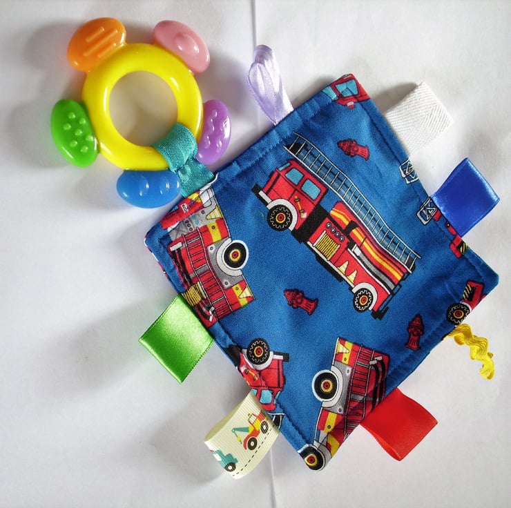 I have attached a brightly coloured silicone teether to this pretty royal blue cotton cloth (5" x 5"), to which I have sewn ribbon tags, of various colours, widths and textures. There are fire engines depicted on both sides of the cloth. All the tags are double stitched for security. I source the teether from a reputable dental supplier and the tagged teether is CE marked. It is machine washable in cool water.