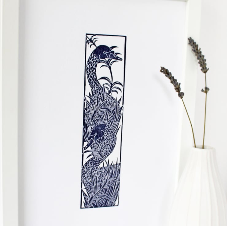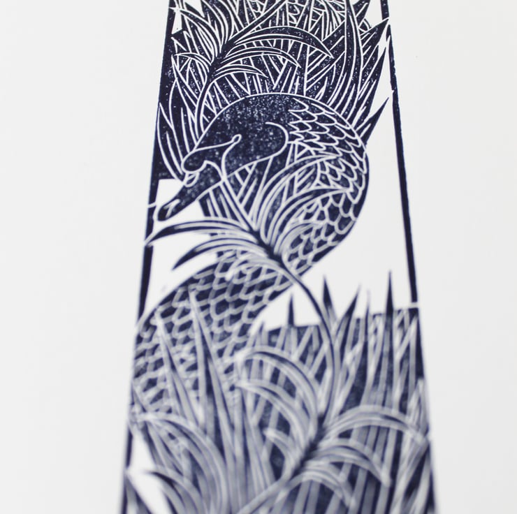 A handmade, limited edition lino print depicting two Swans swimming amidst stylized aquatic plants.