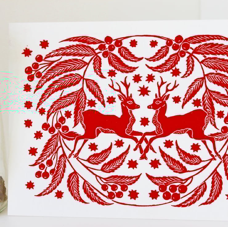 Pack of two cards: hand carved and hand printed festive deer, surrounded by rowan leaves, berries, and stars. Each Christmas card is printed in red on quality 300gsm hammered effect card.
