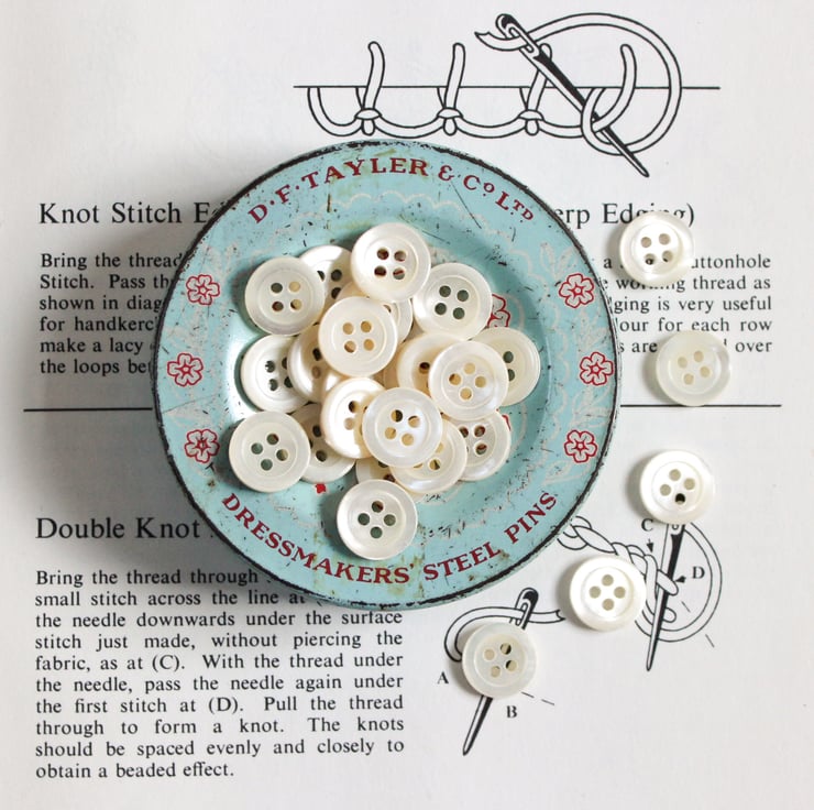 This necklace is so simple and so lovely. It is made with the vintage buttons shown here in the image along with my Aunties Dorcas pin tin and an old embroidery book gifted by a friend from her Nanna (one shilling!). The joy of old haberdashery! And this necklace captures a certain nostalgia, evoking such memories, as well as looking really smart and contemporary.